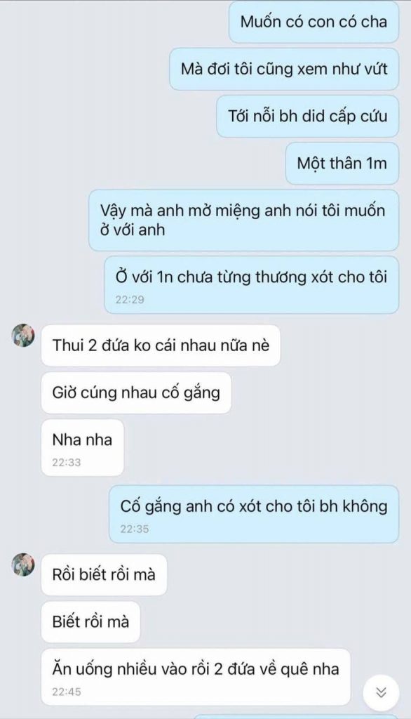 Đến nay là 4 tháng mang thai, em bé yếu, mẹ cũng gầy tọp đi mà chị C phải đi xuống Thanh Hóa, về Hà Tĩnh, lên Hà Nội mấy lần, một thân một mình chỉ mong thằng đó giữ đúng lời hứa: Không cưới nhưng vẫn sẽ sắp xếp tất cả mọi thứ rồi lo cho con tới khi khoẻ mạnh. Hiện tại anh Lực đã trốn về quê, chặn liên lạc, xóa facebook, hẹn hò vô tư như chưa có chuyện gì xảy ra, Còn hai mẹ con khó khăn ôm ấp nhau chẳng biết phải làm sao…