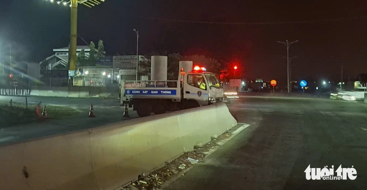 Trong đêm 23-2, lực lượng cảnh sát giao thông Công an tỉnh Lâm Đồng tiếp tục phối hợp cấm xe từ quốc lộ 1 vào cao tốc Phan Thiết – Dầu Giây tại nút giao Ba Bàu – Ảnh: ĐỨC TRONG