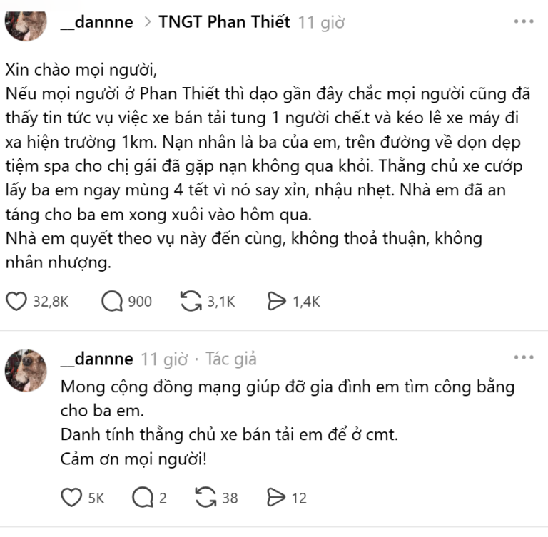 Khi lực lượng chức năng kiểm tra khu vực ngã tư Tôn Đức Thắng – Nguyễn Tất Thành, phát hiện một người đàn ông nằm bất động trên mặt đường, cơ thể đầy thương tích. Nạn nhân được xác định là ông Lê Văn Cường (56 tuổi, ngụ phường Phan Thiết). Cơ quan điều tra xác định từ vị trí phát hiện nạn nhân đến nơi ô tô dừng lại khoảng cách gần 1 km. Dù được đưa đi cấp cứu ngay sau đó, ông Cường không qua khỏi do chấn thương sọ não nặng.