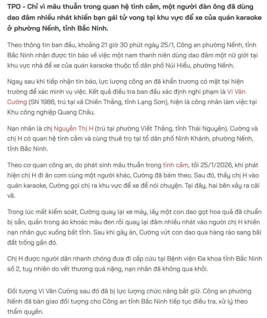 Núi Hiểu đêm qua: Ghen tuông mù quáng, công nhân đâm tuvong bạn gái tại quán karaoke ở Bắc Ninh