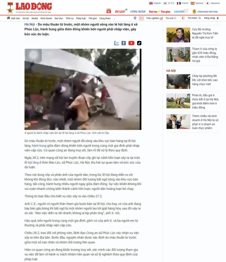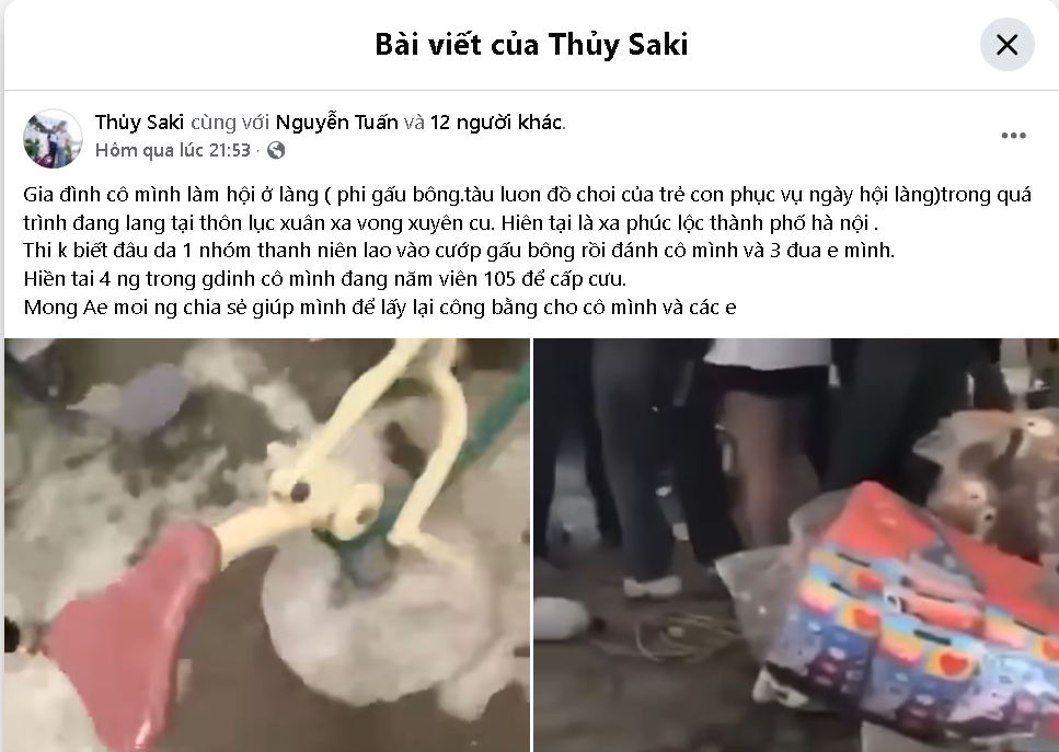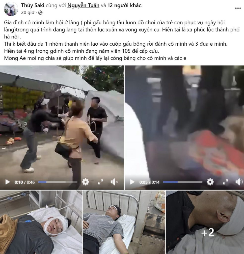 Gia đình cô mình làm hội ở làng ( phi gấu bông.tàu luon đồ choi của trẻ con phục vụ ngày hội làng)trong quá trình đang lang tại thôn lục xuân xa vong xuyên cu. Hiên tại là xa phúc lộc thành phố hà nội .Thi k biết đâu da 1 nhóm thanh niên lao vào cướp gấu bông rồi đánh cô mình và 3 đua e mình.Hiền tai 4 ng trong gdinh cô mình đang năm viên 105 để cấp cưu.Mong Ae moi ng chia sẻ giúp mình để lấy lại công bằng cho cô mình và các e