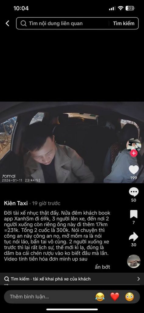 Theo chia sẻ: Nửa đêm book app ✅ đi 69k 3 người lên xe, đến nơi 2 người xuống còn anh này đi thêm 17km = 231k tổng 2 cuốc ~300k. Nói chuyện thì khoe C.a này nọ nhưng mở miệng thì nói bậy vô cùng. 2 người xuống trước thì rất lịch sự. Đúng là có 3 ly rịu vào không biết đâu mà lần.