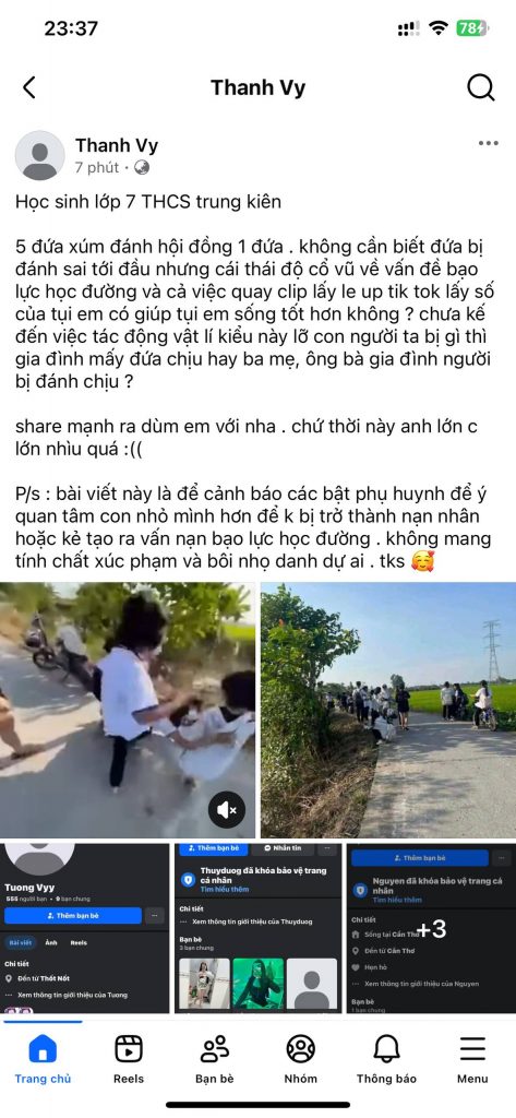 “Bài viết này là để cảnh báo các bật phụ huynh để ý quan tâm con nhỏ mình hơn để k bị trở thành nạn nhân hoặc kẻ tạo ra vấn nạn bạo lực học đường . không mang tính chất xúc phạm và bôi nhọ danh dự ai . tks