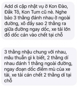 TNGT: Nghe nói có mâu thuẫn trong lúc nhậu, 3 người ra đường xô xát thì bị xe ben đang xuống dốc cán khiến 2 người không qua khỏi ở Đắk Tô, Kon Tum(cũ)